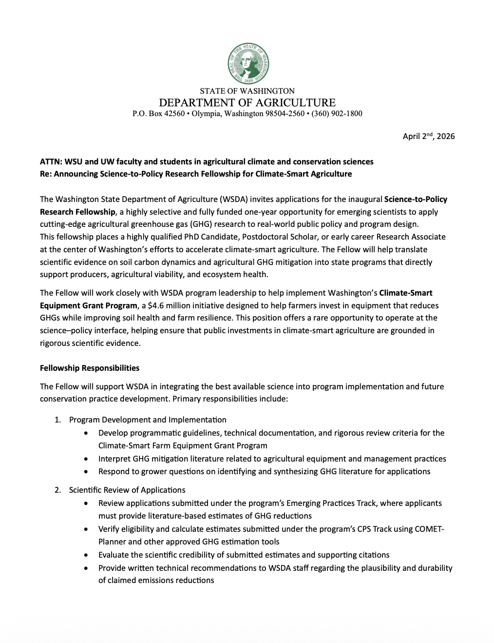 The Washington State Department of Agriculture is pleased to announce a fully funded one-year opportunity for emerging scientists to apply cutting-edge agricultural greenhouse gas (GHG) research to real-world public policy and program design. This fellowship places a highly qualified PhD Candidate, Postdoctoral Scholar, or early career Research Associate at the center of Washington’s efforts to accelerate climate-smart agriculture. The Fellow will help translate scientific evidence on soil carbon dynamics and agricultural GHG mitigation into a state grant program that directly support producers, agricultural viability, and ecosystem health.
